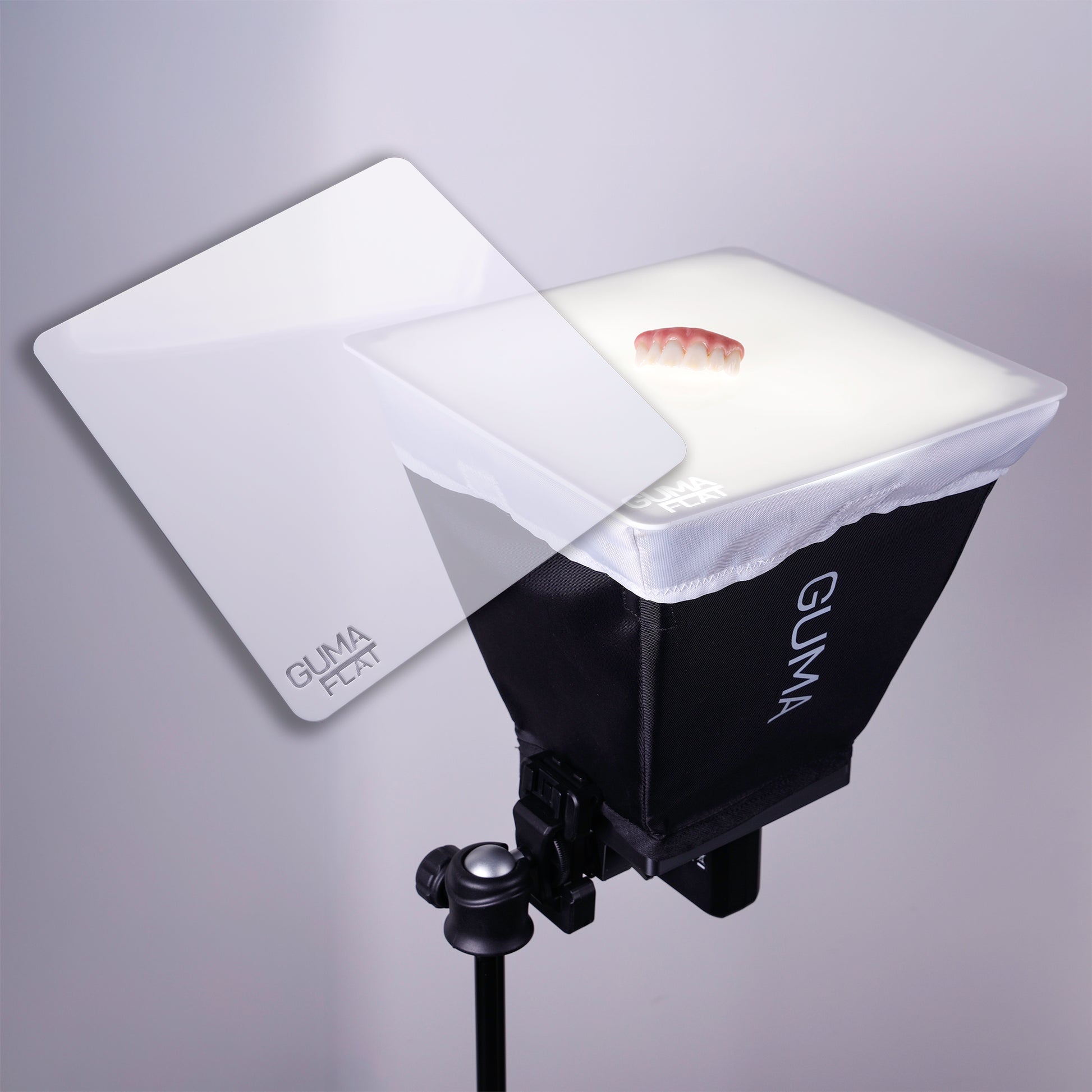 GUMA FLAT é uma placa branca translúcida polida para você apoiar sobre seu SOFTBOX GUMA que serve para realizar fotografias de peças protéticas e produtos com o fundo 100% branco.